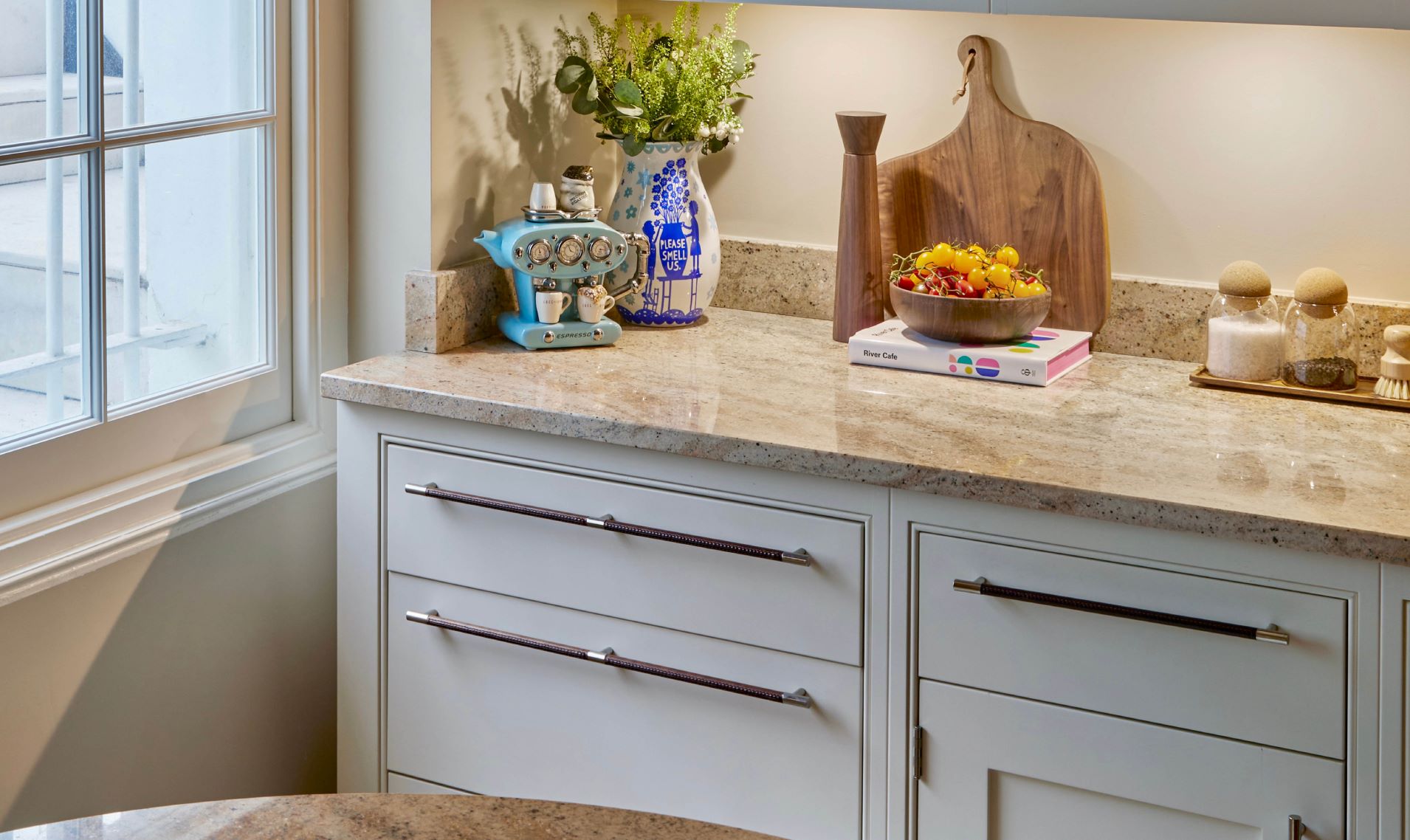 Using Turnstyle’s ‘Made to Measure’ service, longer handles with extra legs were created for the cabinetry and appliances in the kitchen.